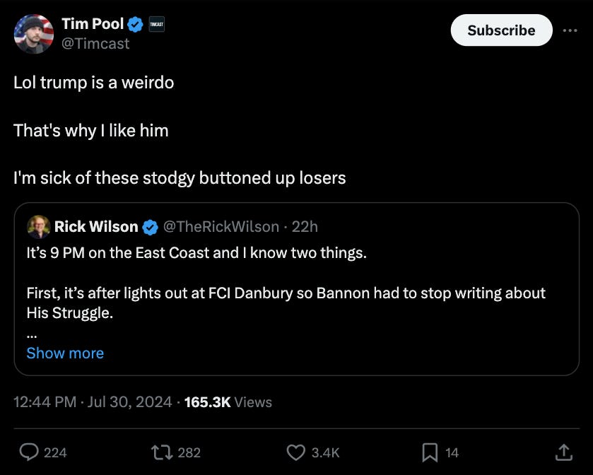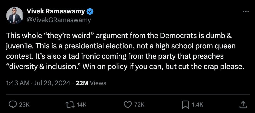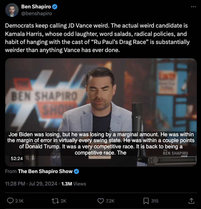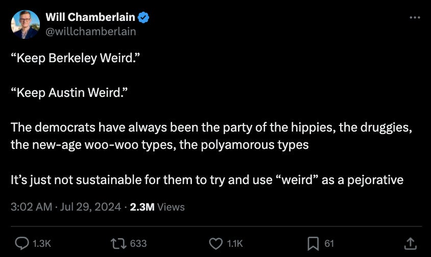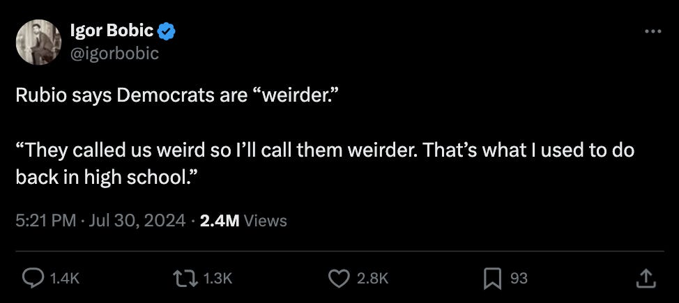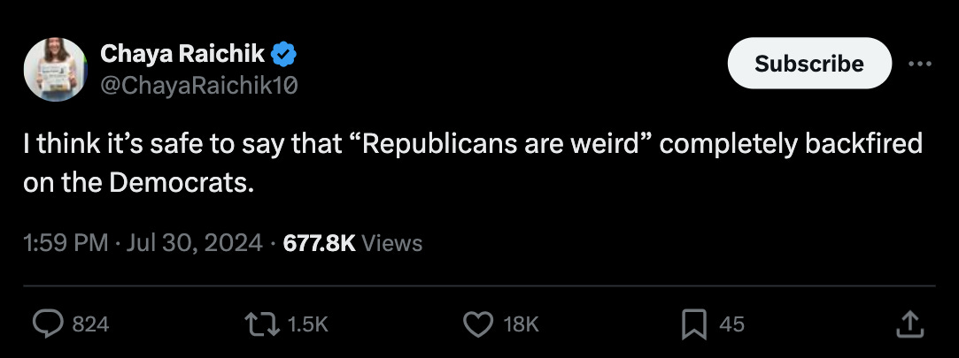 From there, other Democrats, and generally left-leaning people in the public eye, began slipping this innocuous-yet-effective insult into their discussions of Republicans and the right-wing in the days after. Kamala Harris, Pete Buttigieg, and Chuck Schumer (to name just a few) are among those who have gone on record using the word “weird” to describe Donald Trump, his ideas, his couch-fucking running mate J.D. Vance, Republican policies, and the weird beliefs and behaviour of the right-wing in general.