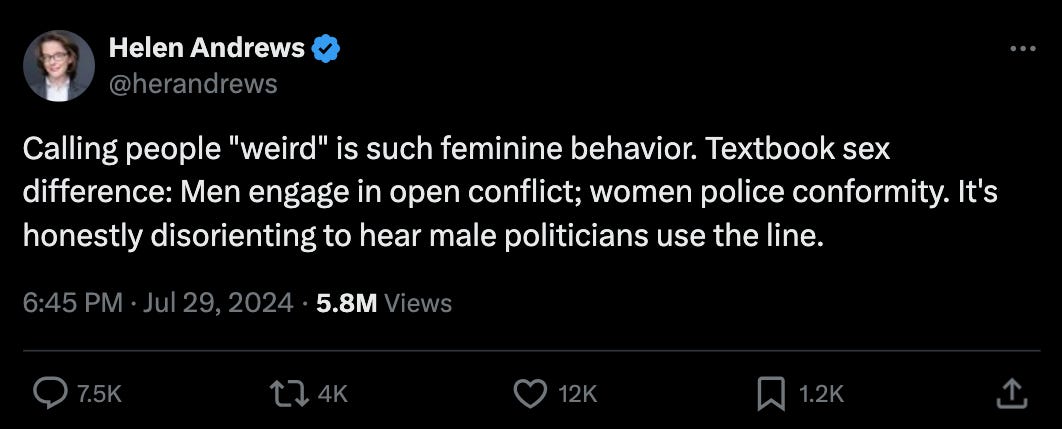 Patient Zero for the word’s recent widespread public utilisation through the ranks of the Democratic Party has been credited to Governor Tim Walz of Minnesota, who said on MSNBC on July 24th: “These are weird people on the other side. They wanna take books away. They wanna be in your exam room. That’s what it comes down to, and don’t, y’know, get sugar-coating this [sic], these are weird ideas.”